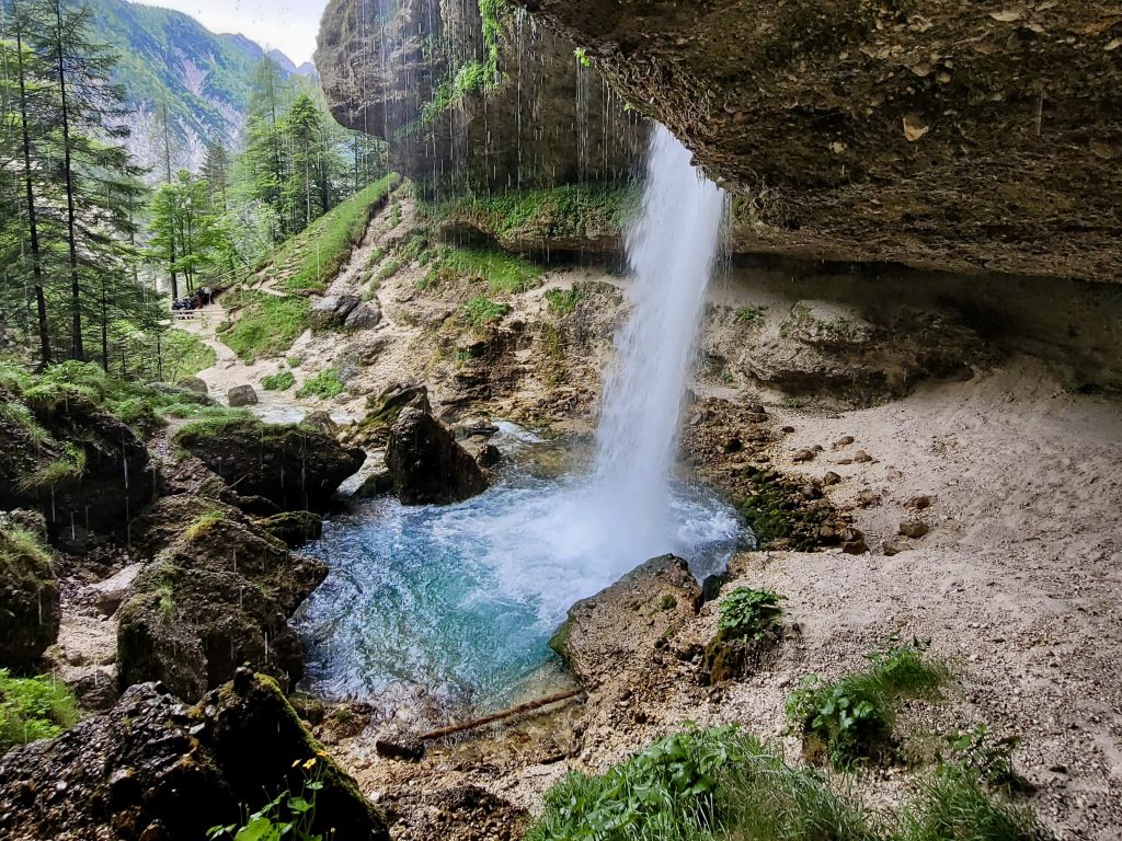 What sets Peričnik apart is its rare natural formation. The water plunges over a wide rock overhang, creating enough space for visitors to walk safely behind the cascading curtain — an unforgettable experience.