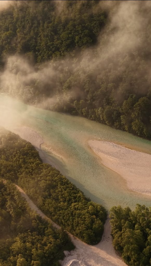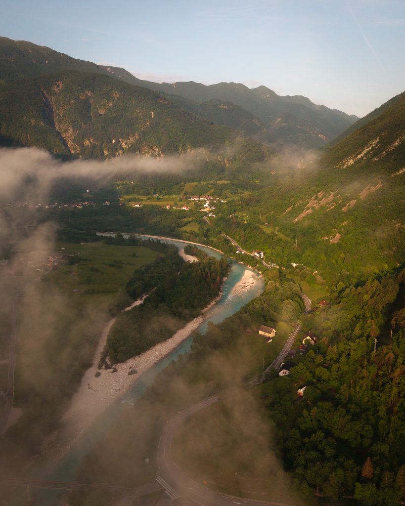 Meglica lebdi nad smaragdno reko. Zrak je hladen, Svež, skoraj tih. Visoka Pobočja Julijskih Alp se rišejo kot temne silhuete proti bledemu nebu.